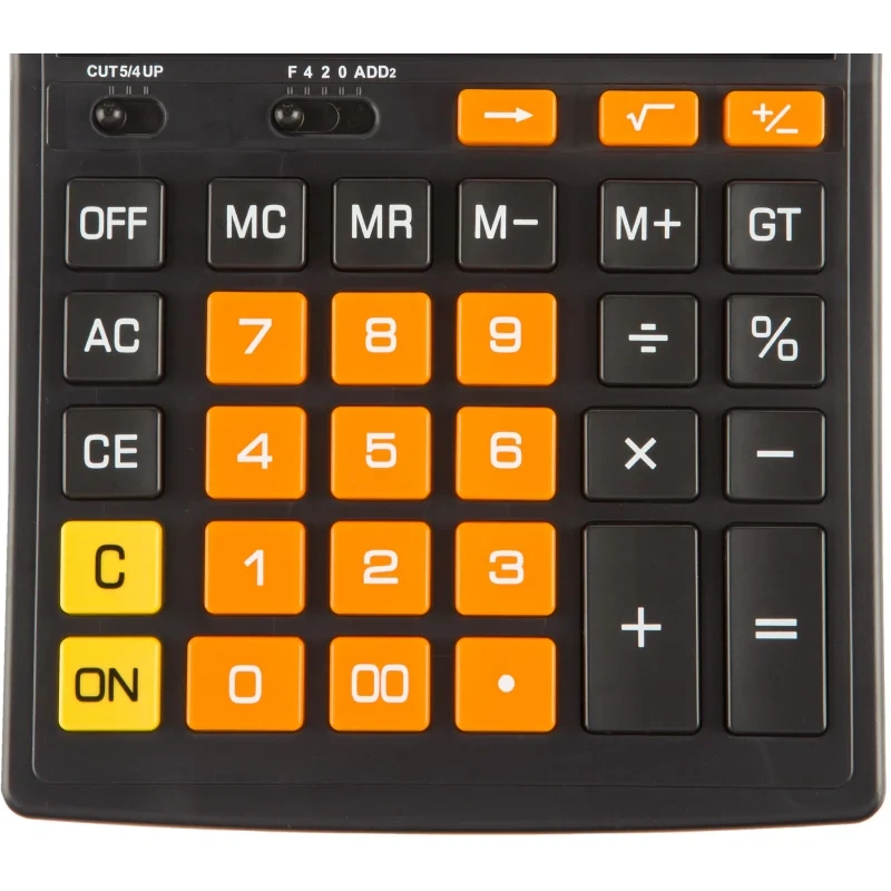 Эргономичная форма панели и крупные клавиши создают максимальный комфорт в использовании. Корпус изготовлен в черном цвете с кнопками оранжевого цвета. Оптимальный и необходимый набор функций, среди которых: независимая память, MC, MR, M+, M-, GT, расчет процентов, округление. Функция вычисления налога: нет. Функция коррекции вычислений: нет. Пересчет курса валюты: нет. Наклонный дисплей: фиксированный. Большой двенадцатиразрядный дисплей отображает большие значения с высокой точностью округления. В калькуляторе имеется два источника питания: батарейка типа LR44 (входит в комплект) и солнечная батарея.