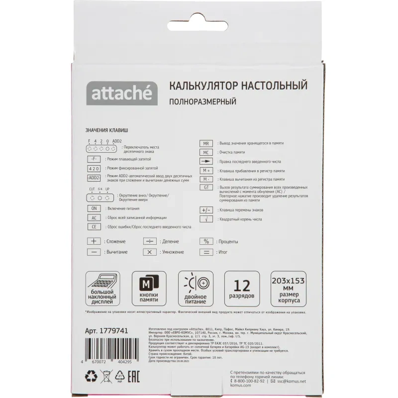 Калькулятор Attache полноразмерный настольный AF-446BR настольный с 12-разрядным ЖК-дисплеем.