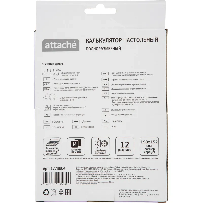 Калькулятор Attache настольный AF-447Р полноразмерный с 12-разрядным ЖК-дисплеем.
