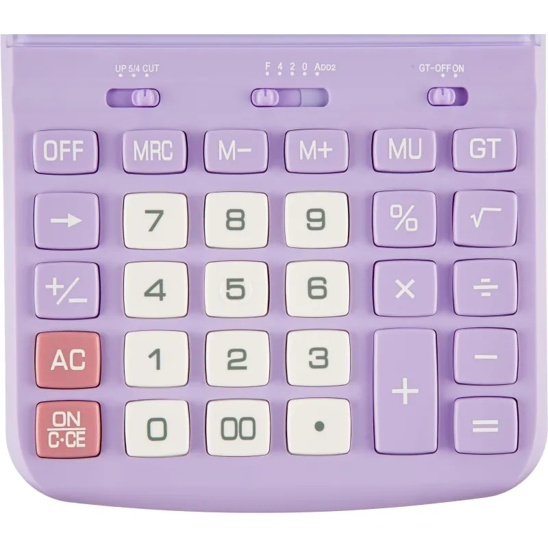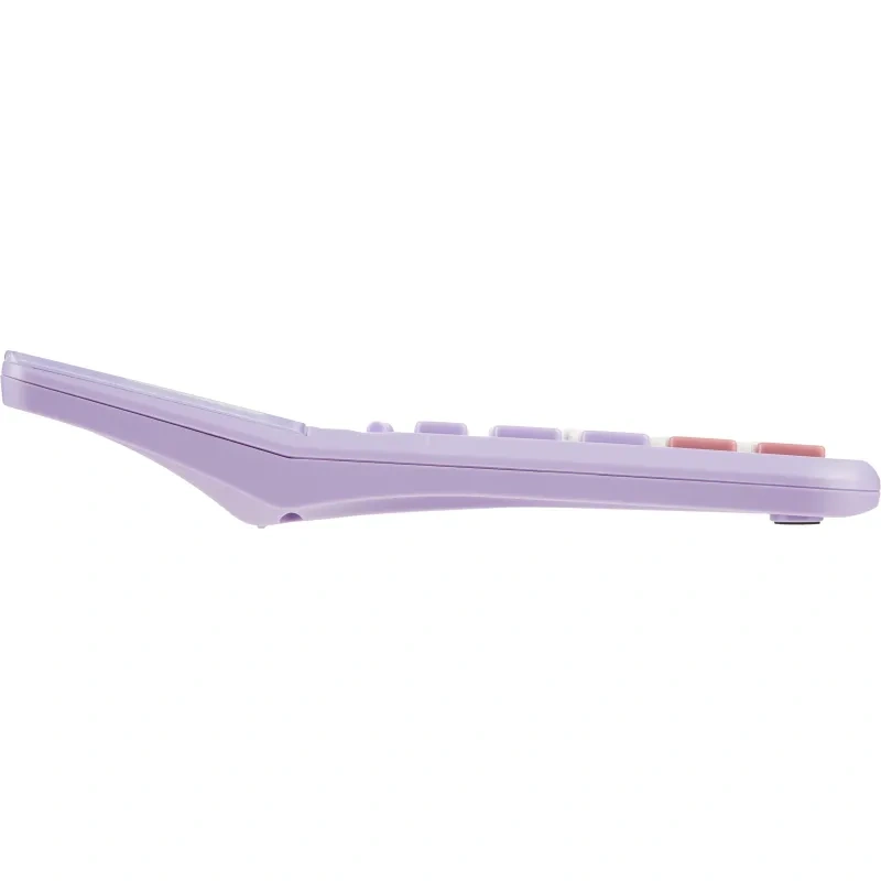 Эргономичная форма панели и крупные клавиши создают максимальный комфорт в использовании. Корпус изготовлен в фиолетовом цвете с кнопками белого цвета. Оптимальный и необходимый набор функций, среди которых: MC, MR, M+, M-, GT, MU, расчет процентов, округление. Функция коррекции вычислений: нет. Функция вычисления налога: нет. Пересчет курса валюты: нет. Наклонный дисплей: фиксированный. Большой двенадцатиразрядный дисплей отображает большие значения с высокой точностью округления. В калькуляторе имеется два источника питания: батарейка типа LR44 (входит в комплект) и солнечная батарея.