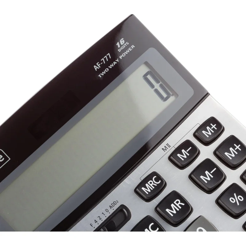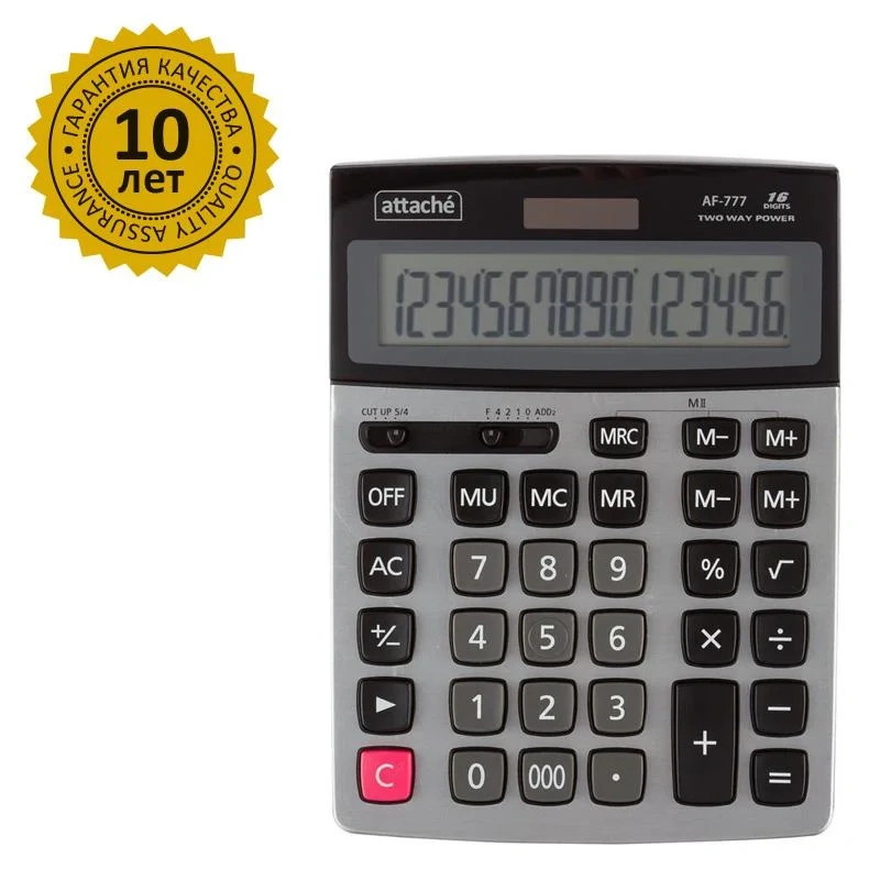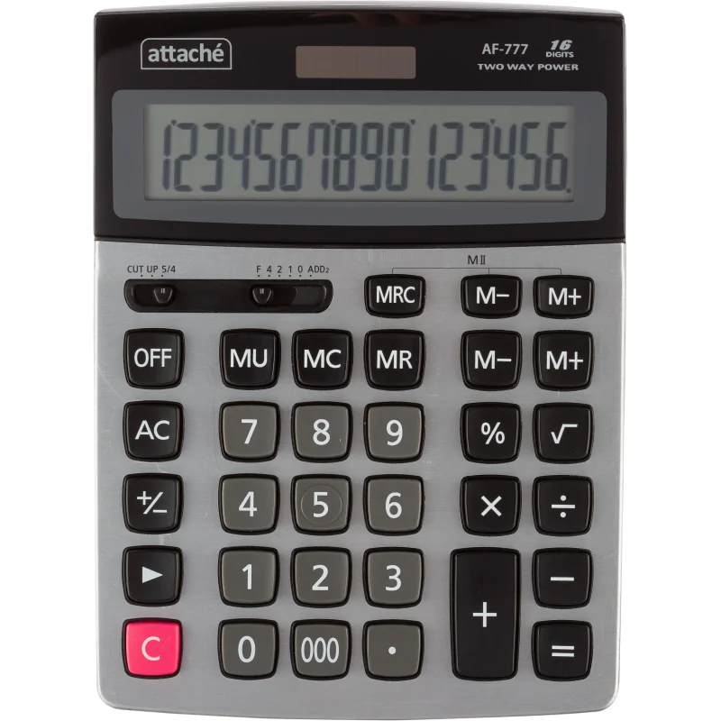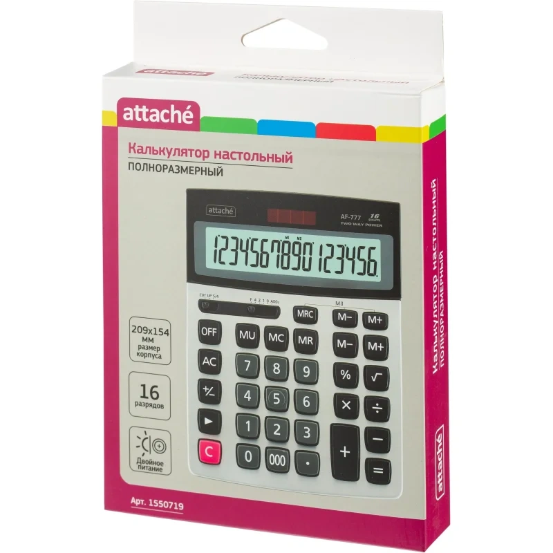 Калькулятор настольный ПОЛНОРАЗМ. Attache AF-777 16р,дв.пит,209x154мм, черн Калькулятор Attache AF-777 настольный в пластиковом корпусе с 16-разрядным дисплеем. В калькуляторе имеется два источника питания: солнечная батарея и 1 батарейка LR54. Размер: 205x155x35 мм. Тип клавиатуры: пластик.