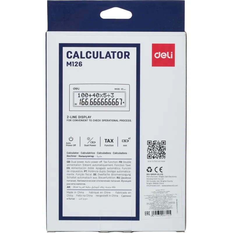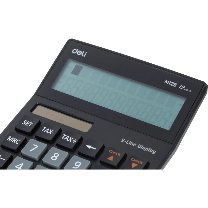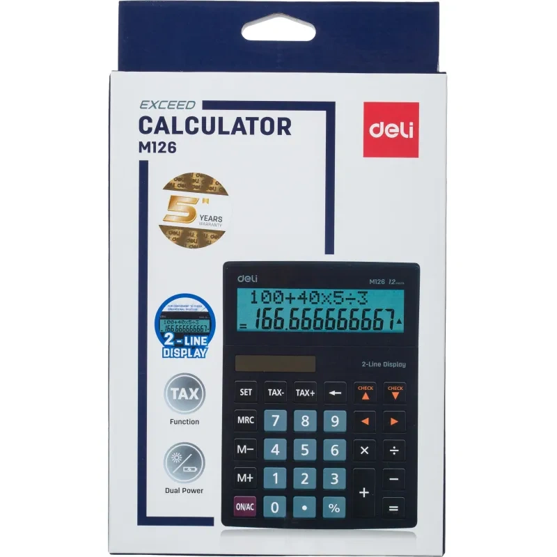 Калькулятор настольный полноразмерный Deli EM126 в пластиковом корпусе, предназначен для выполнения сложных математических расчетов. Изготовлен из противоударного пластика. Калькулятор Deli — незаменимый помощник в офисе, школе и дома. Он компактный, удобный, прочный и надежный. Оптимальный набор функций поможет автоматизировать расчеты: коррекция последнего введенного значения, расчет процентов, двойная память, расчет наценки, смена знака. Большой яркий дисплей калькулятора, эргономичный наклон корпуса и крупная клавиатура позволяют работать эффективнее. Может использоваться как бухгалтерский, школьный, офисный или домашний калькулятор. Имеет защиту памяти при отключении питания. Автоматическое отключение через 8 мин без использования, что увеличивает срок службы калькулятора. Двойное питание (солнечная батарея). Благодаря компактному размеру калькулятор не займет много места на рабочем столе. Оригинальный строгий дизайн порадует каждого покупателя. Цвет: черный. Размер: 182×129×44 мм. Количество строк дисплея: двухстрочный. Разрядность дисплея: 12. Тип питания: 1 батарейка AAA. Тип дисплея: LCD, монохромный. Гарантия: 5 лет.