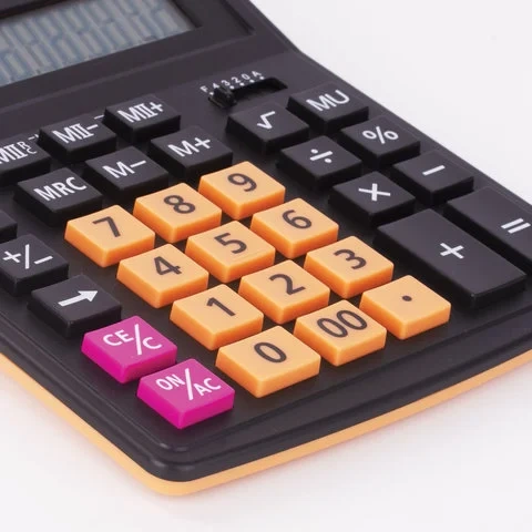 Имеет две независимые памяти, возможность установки режимов округления и ограничения количества знаков после запятой, клавишу корректировки последнего знака, клавишу 'Два нуля' и клавишу расчета наценки. Разрядность дисплея - 12 выводимых на табло цифр, позволяет работать с крупными числами. Клавиша вычисления MU предназначена для финансовых расчетов с учетом торговой наценки. Также калькулятор поможет быстро рассчитать проценты. Для экономии энергии предусмотрены два источника питания: солнечная и алкалиновая батареи. Выполнен в черном цвете с яркими клавишами, такое сочетание отлично впишется в офисный и домашний интерьер.