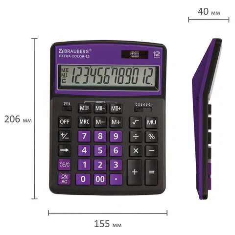 Калькулятор настольный BRAUBERG EXTRA COLOR-12-BKPR (206x155 мм),12 разрядов, двойное питание, ЧЕРНО