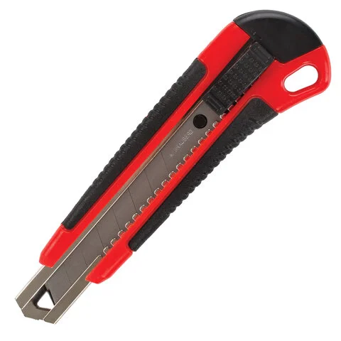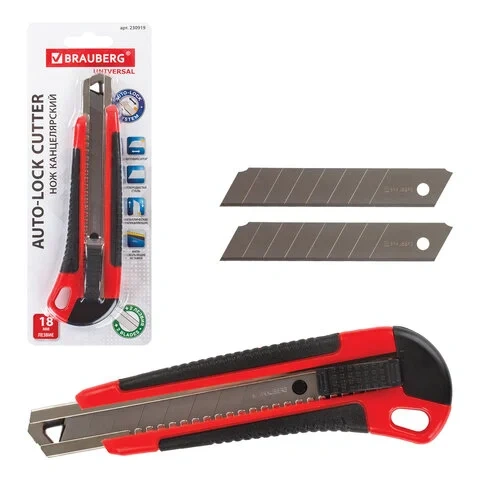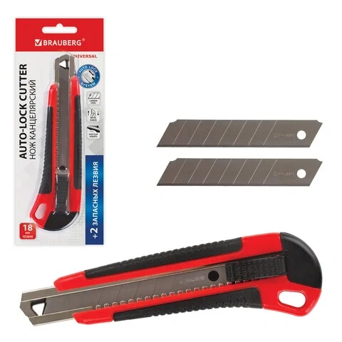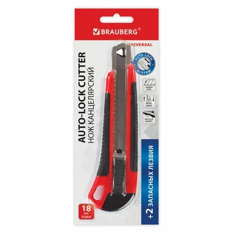 Нож канцелярский 18 мм BRAUBERG 'Universal', 3 лезвия в комплекте, автофиксатор, черно-красный, 2713
