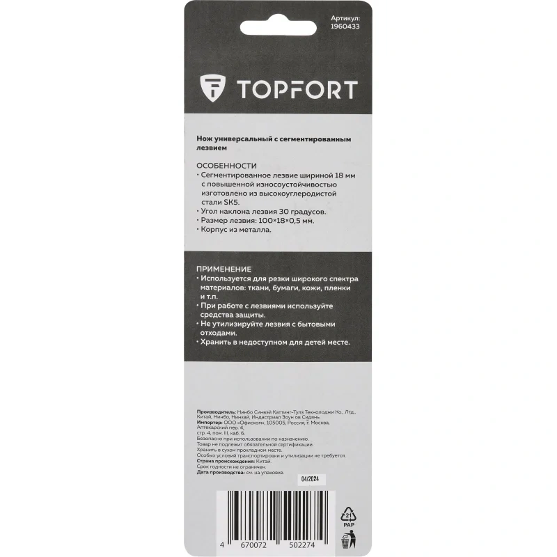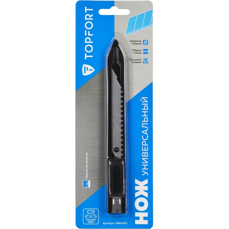 Нож универсальный TOPFORT 18мм металл.корпус, лезвие 30град