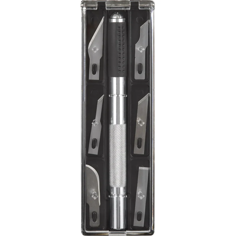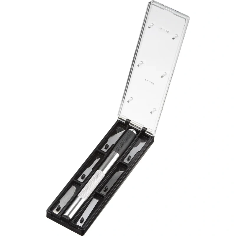 Нож макетный TOPFORT Набор 7поз:нож мет.+TPR+6 шир.лезв.разн.тип,пласт.бокс