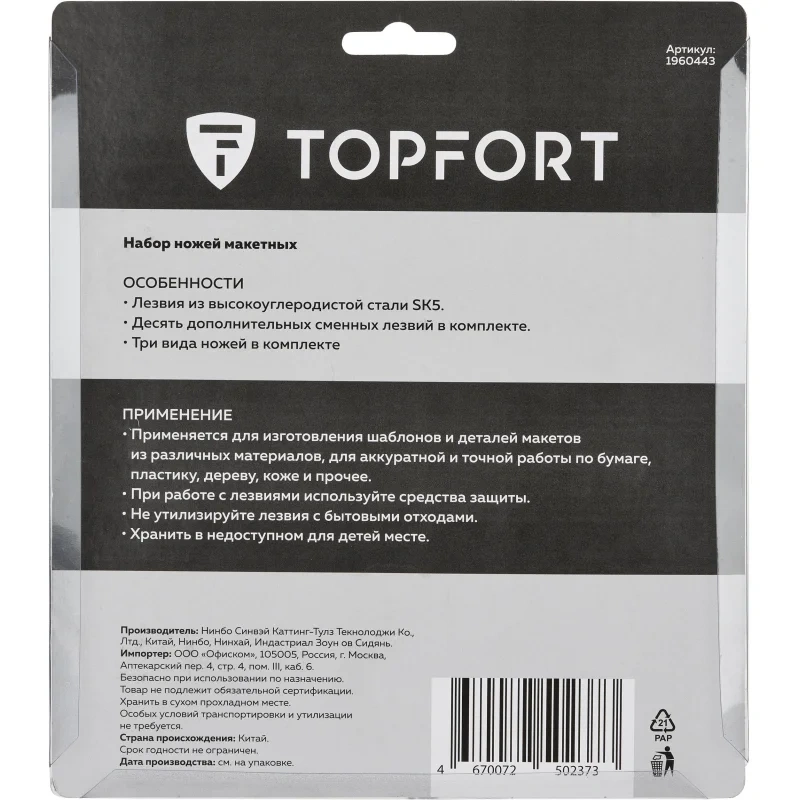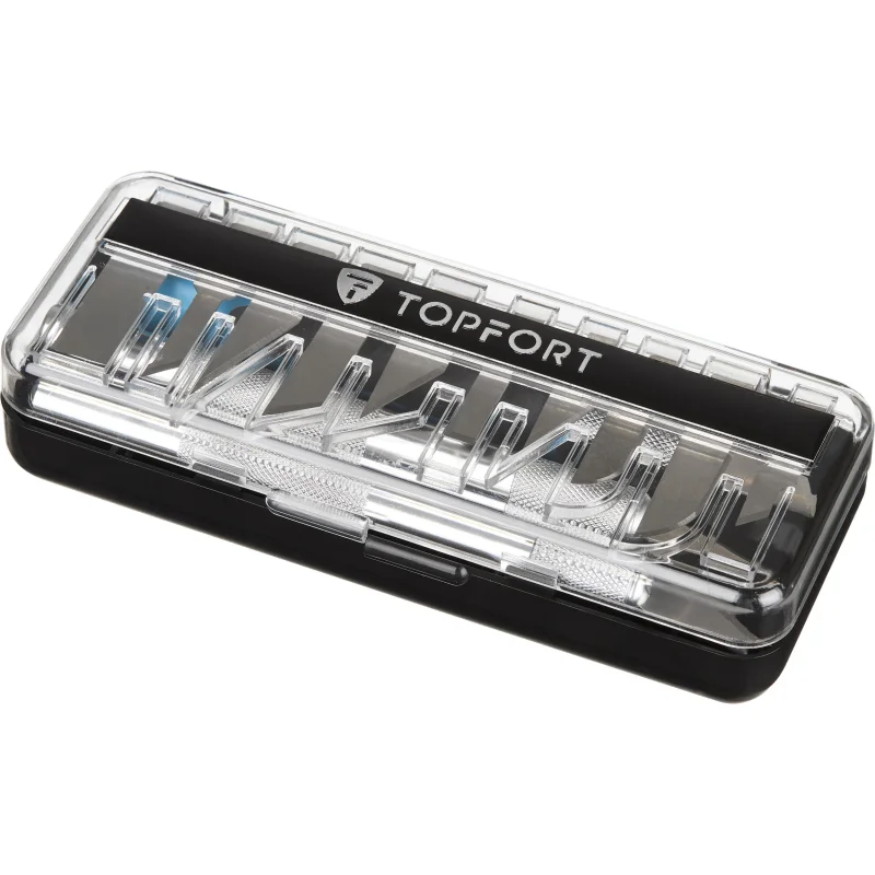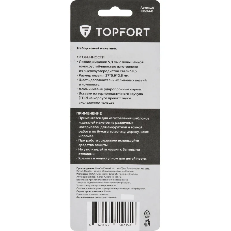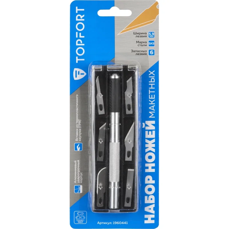 Нож макетный TOPFORT Набор 7поз.:нож мет.+TPR + 6лезв.разн.тип,пласт.бокс