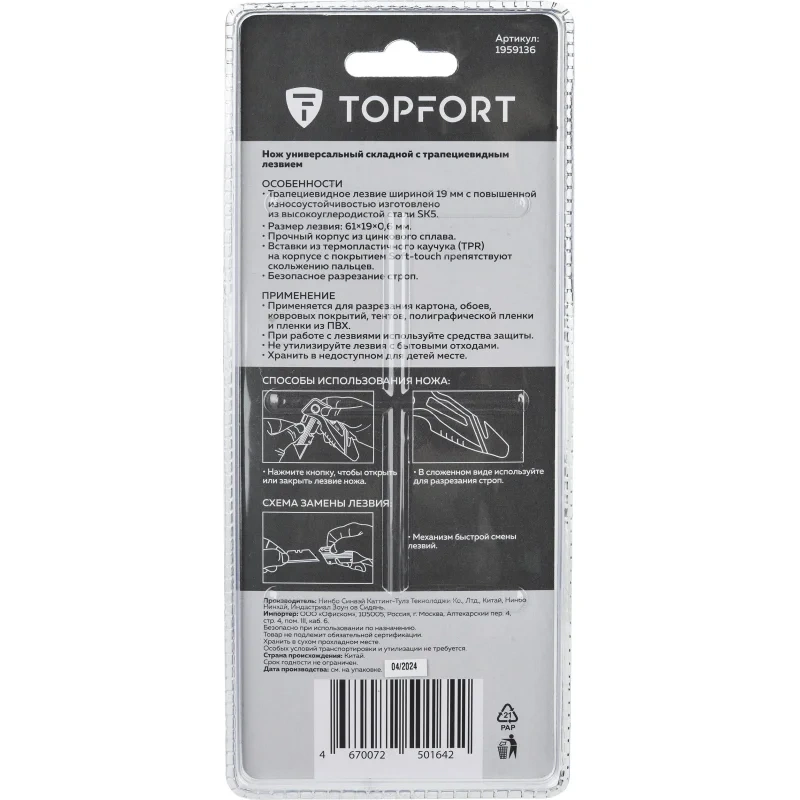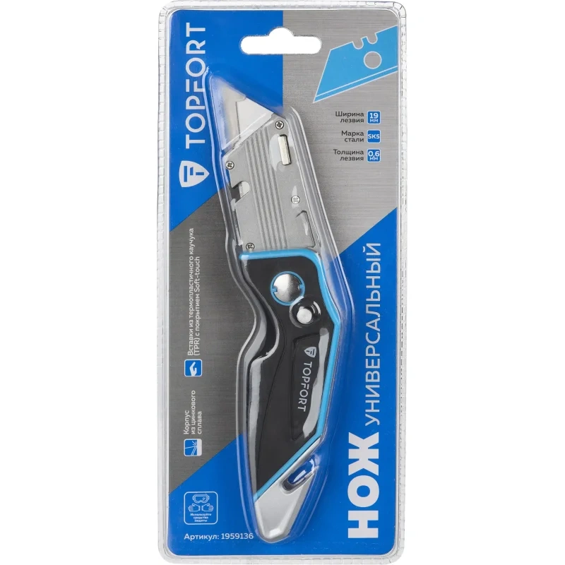 Нож универсальный TOPFORT складной с выдв.лезв. 19мм трапец.+2зап.лезв