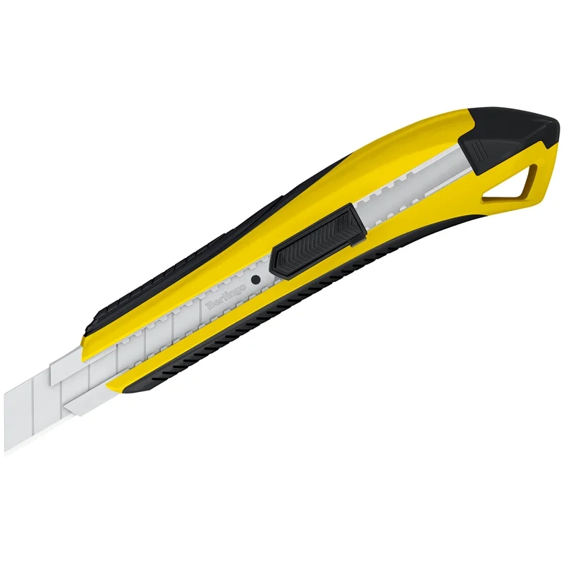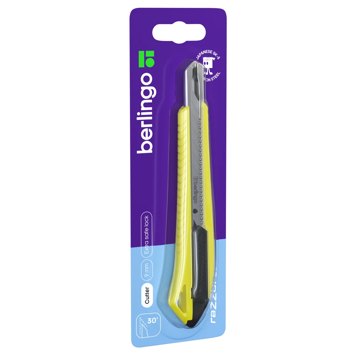 Нож канцелярский 9мм Berlingo 'Razzor 300', auto-lock, металл. направл., мягкие вставки, желтый, евр