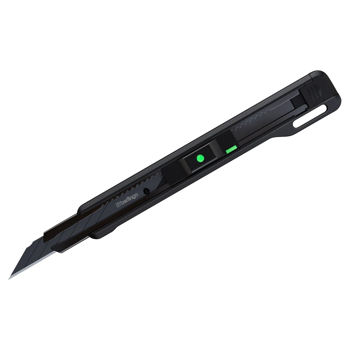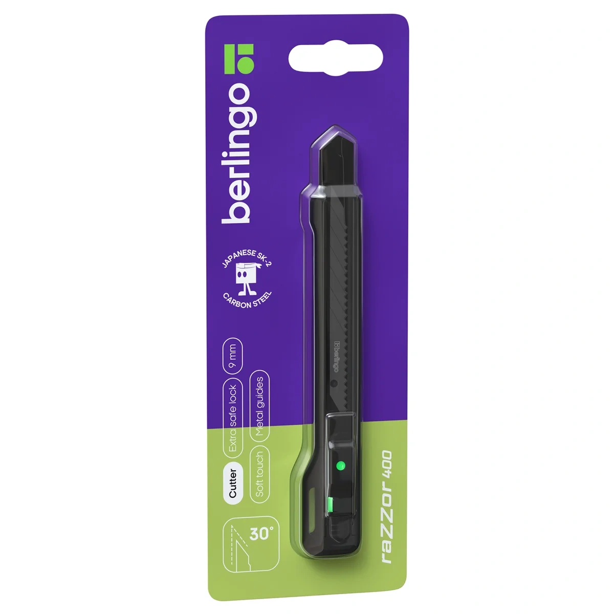 Нож канцелярский 9мм Berlingo 'Razzor 400', черное лезвие, auto-lock, металл. направл., европодвес