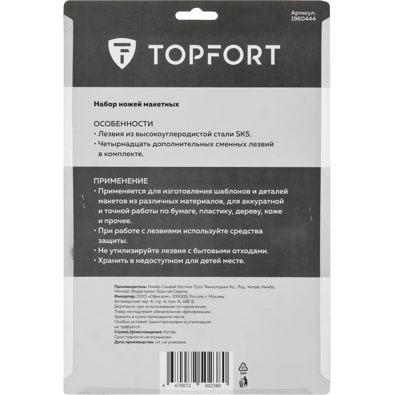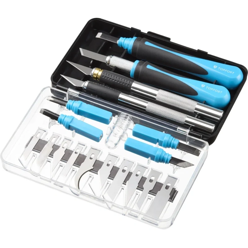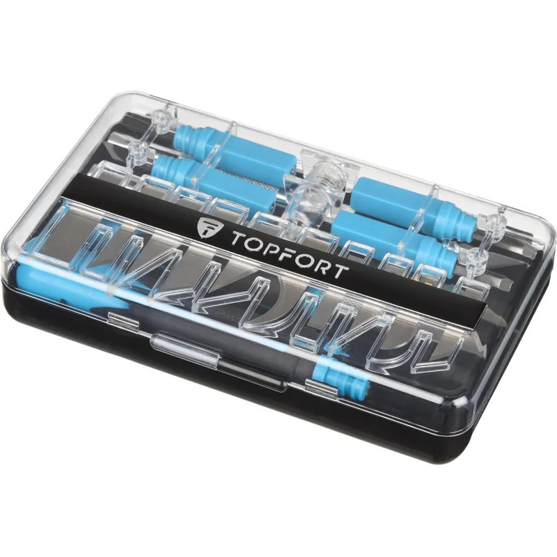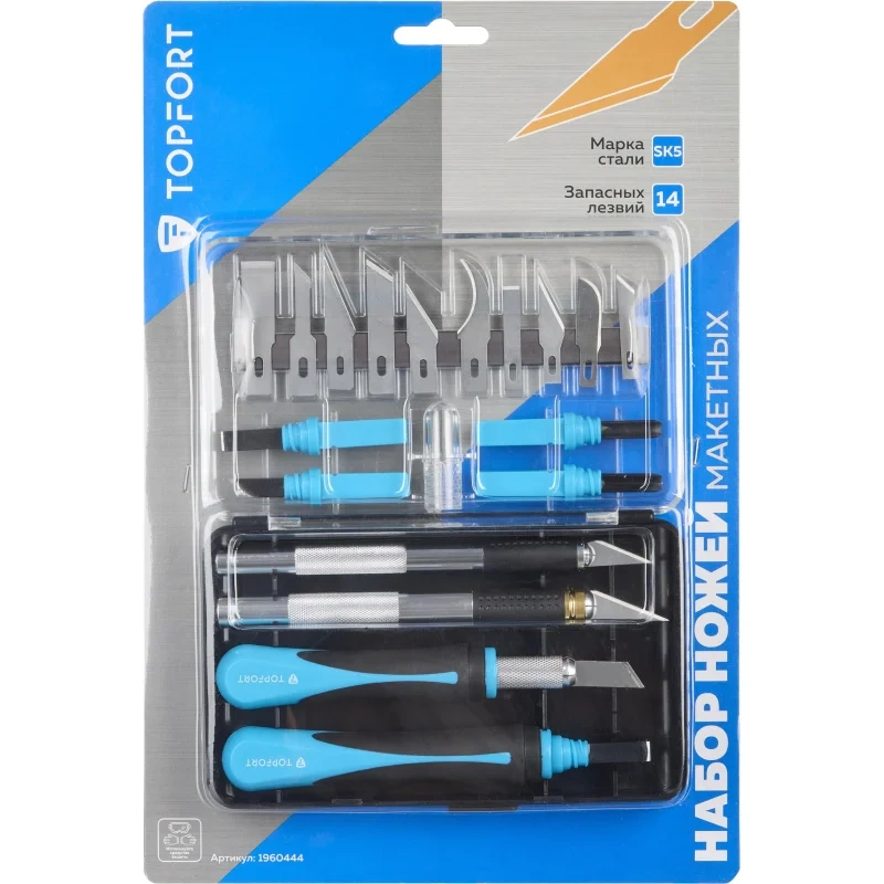 Нож макетный TOPFORT Набор 22поз:нож 4шт,смен.насад.4шт,14лез.раз.тип,бокс