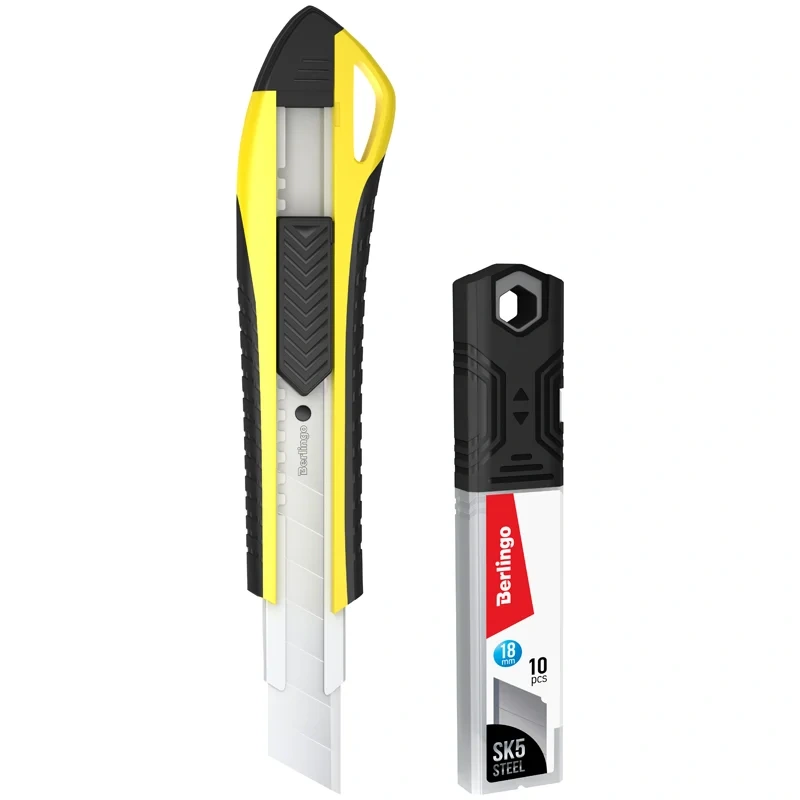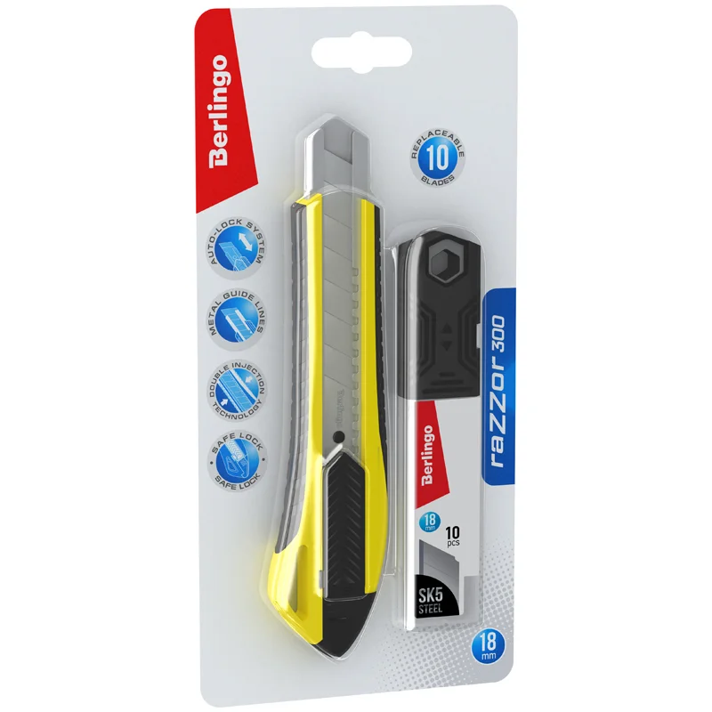 Нож канцелярский 18мм Berlingo 'Razzor 300', желтый + лезвия сменные 10шт., блистер, европодвес