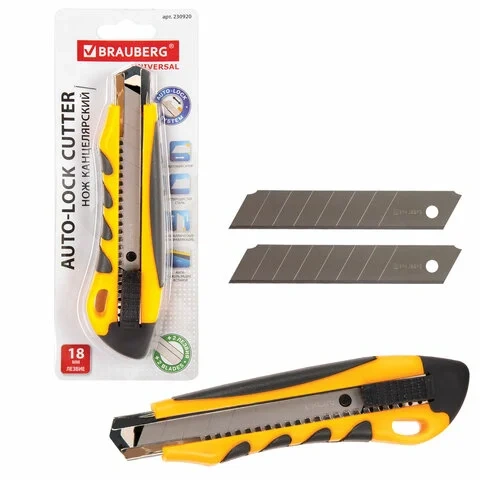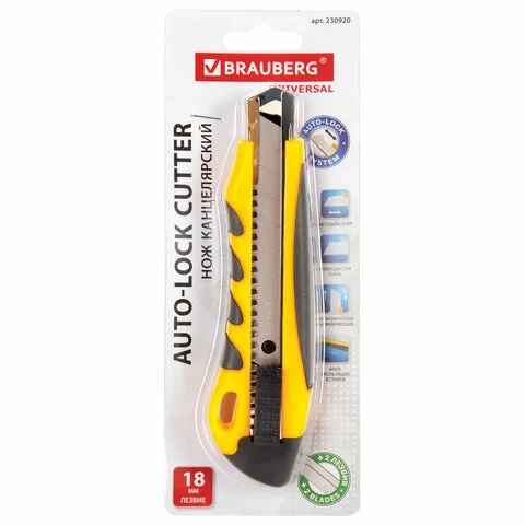 Канцелярский нож Brauberg 18мм, 2 сменных лезвия, ассорти, резиновая вставка, 230920