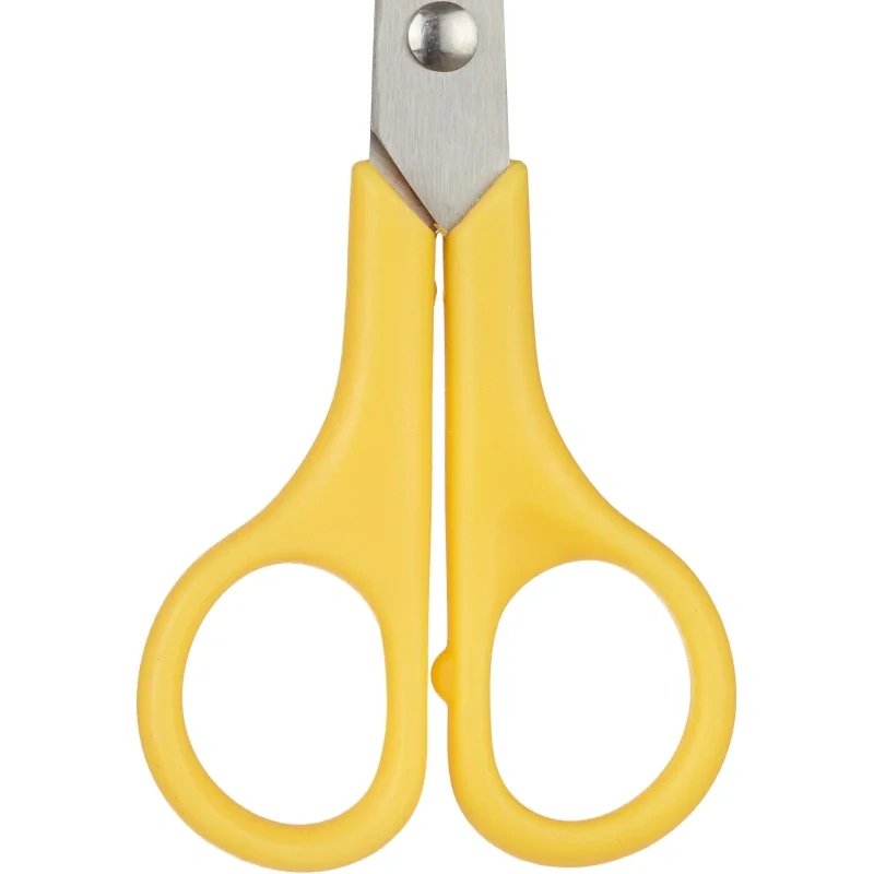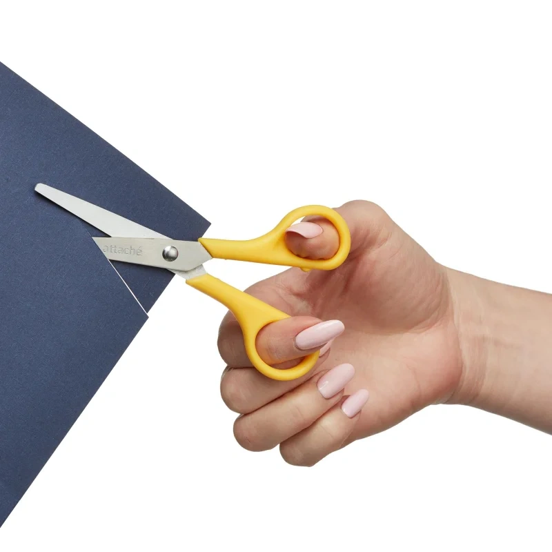 Канцелярские ножницы (офисные) Attache с тупоконечными лезвиями, выполненными из стали. Симметричные пластиковые кольца яркого желтого цвета обеспечивают комфортную работу с материалами любой плотности: бумага, картон, ткань, пленка. Двухсторонняя заточка лезвий.