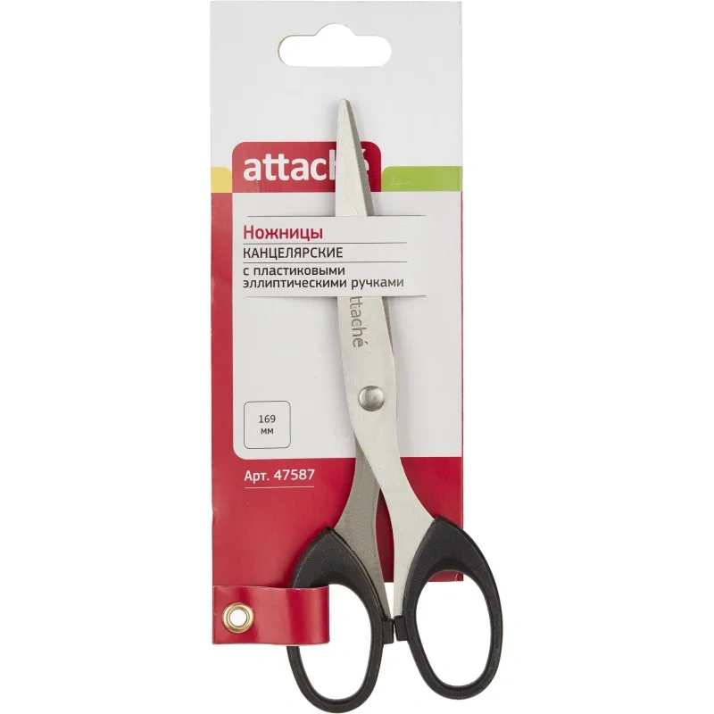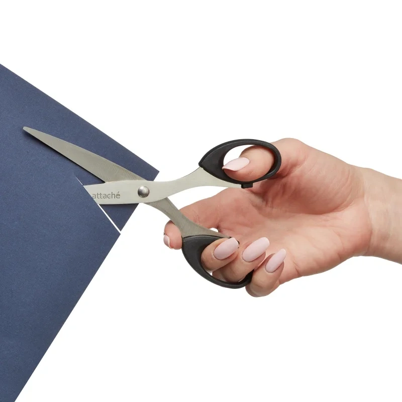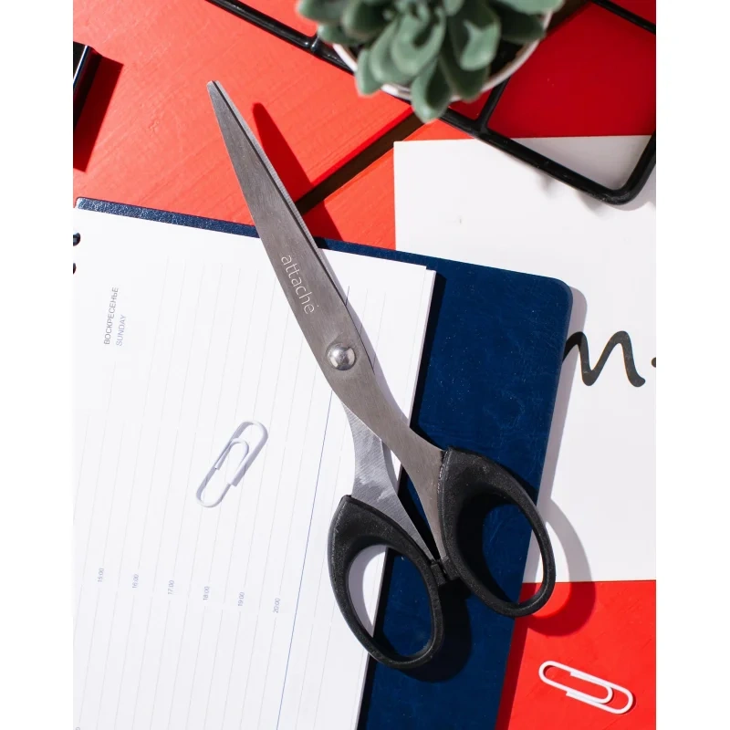 Канцелярские ножницы (офисные) Attache классического дизайна. Удлиненные лезвия выполнены из нержавеющей стали. Цвет колец — черный. Симметричные пластиковые ручки эллиптического формы обеспечивают комфортную работу с материалами любой плотности: бумага, картон, ткань, пленка. Двухсторонняя заточка лезвий.