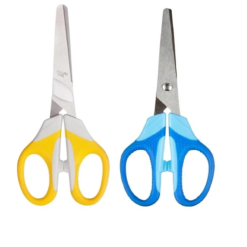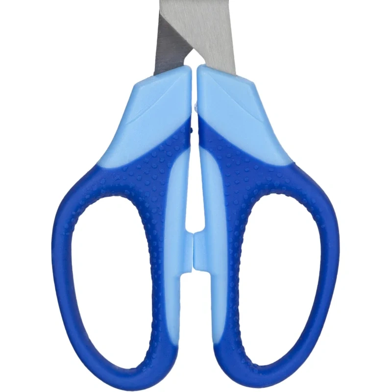 Лезвия у ножниц выполнены из высококачественной нержавеющей стали с закруглённым концом для повышенной безопасности. Симметричные кольца синего цвета с резиновыми вставками предотвращают скольжение пальцев. Фиксатор отсутствует. Ножницы представлены на картонной подложке с европодвесом.