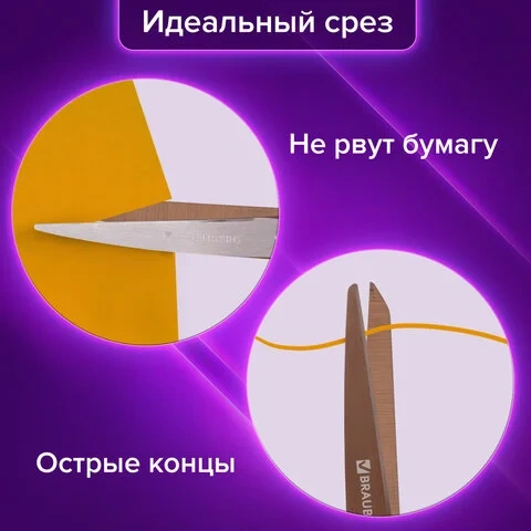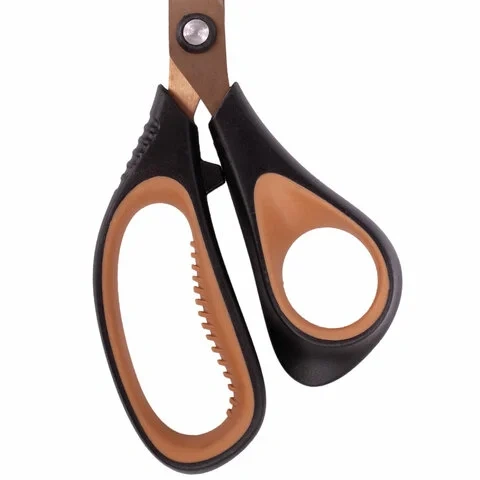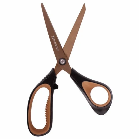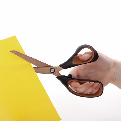 Титановое напыление лезвий с двусторонней заточкой способствует необходимой прочности, устойчивости к износу и комфортному выполнению работы. Золотистый цвет лезвий обеспечивает уникальный стиль изделия. Эргономичные ручки изготовлены из пластика и дополнены характерными резиновыми вкладышами. Длина ножниц – 210 мм.