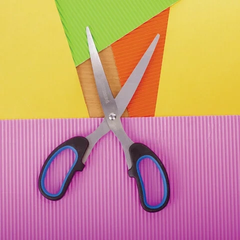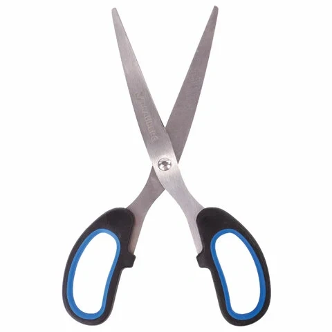 Ножницы длинной 185 мм, с остро заточенными лезвиями, позволяют работать с бумагой и прочими материалами. Ручки классической формы с резиновыми вставками удобно лежат в руке, не перетруждая ее. Черно-синий дизайн нейтрален и не выделяет инструмент среди прочих канцелярских принадлежностей. Поставляется на картонной обложке с европодвесом.