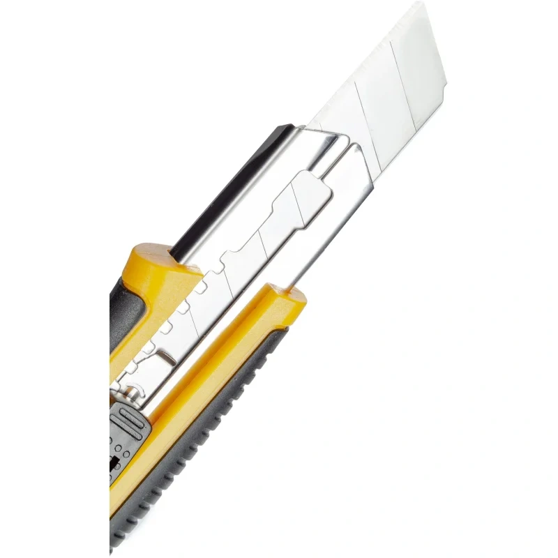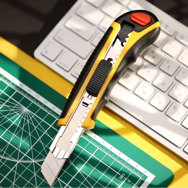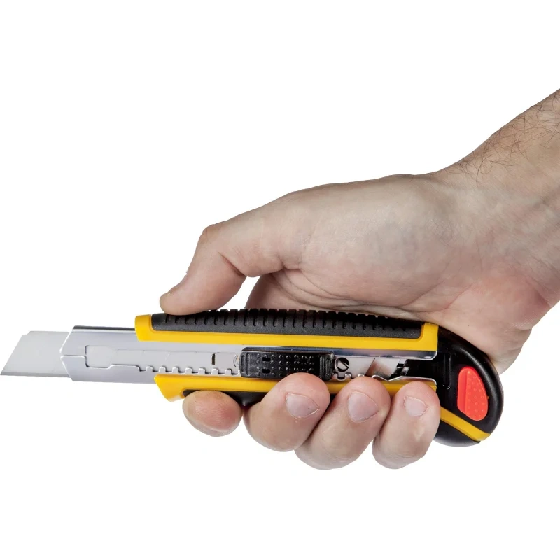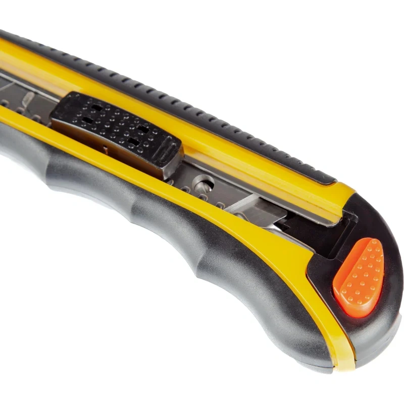 Нож универсальный канцелярский Attache Selection с сегментированным отламывающимся лезвием. Используется в канцелярии, при разрезании бумаг, картона, распечатывании корреспонденции, посылок и прочих работах. Эргономичная рукоятка с резиновыми вставками контрастного цвета, для увеличения противоскользящих свойств. Металлические направляющие для лезвия увеличивают прочность ножа, создают дополнительную жесткость при разрезании плотных материалов.