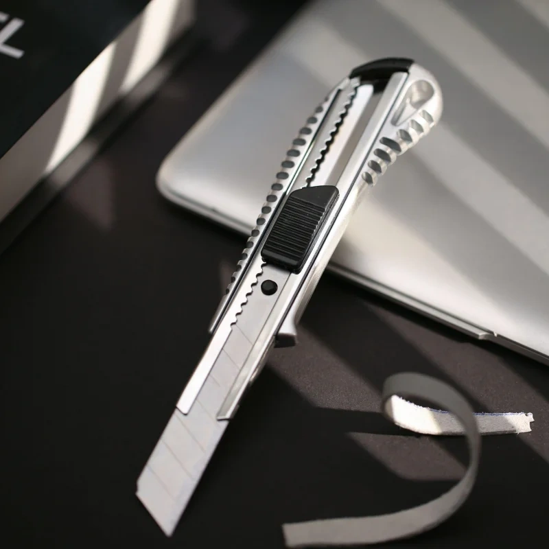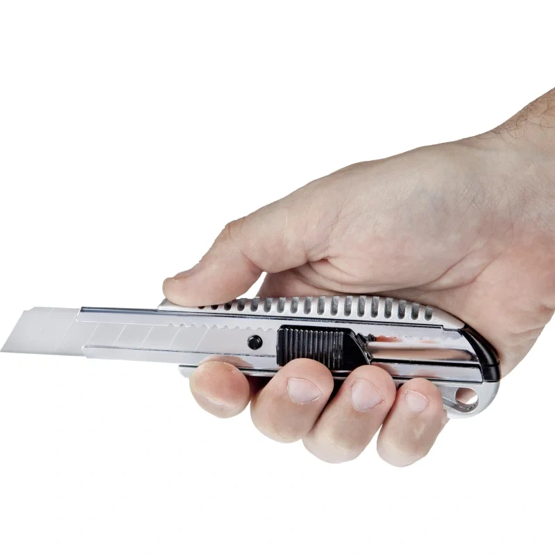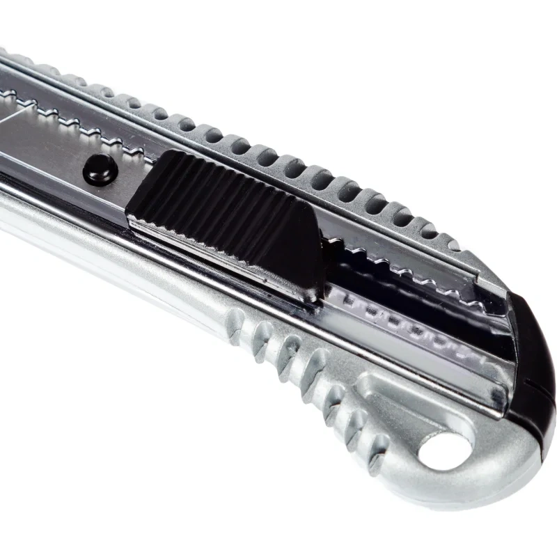 Нож универсальный Attache Selection с цинковым покрытием ширина лезвия 18 мм. Нож универсальный Attache Selection с сегментированным отламывающимся лезвием. Подходит для резки бумаги, плёнки, ленты стрейч, кожи, для складских работ, а также для проведения ремонтных работ, не требующих приложения больших усилий. Эргономичный, надёжный корпус с пластиковыми вставками с рифлением. Металлическая направляющая из нержавеющей стали обеспечивает надёжную фиксацию лезвия в момент использования.