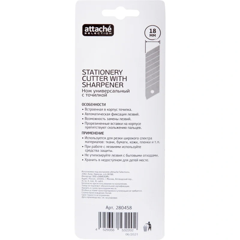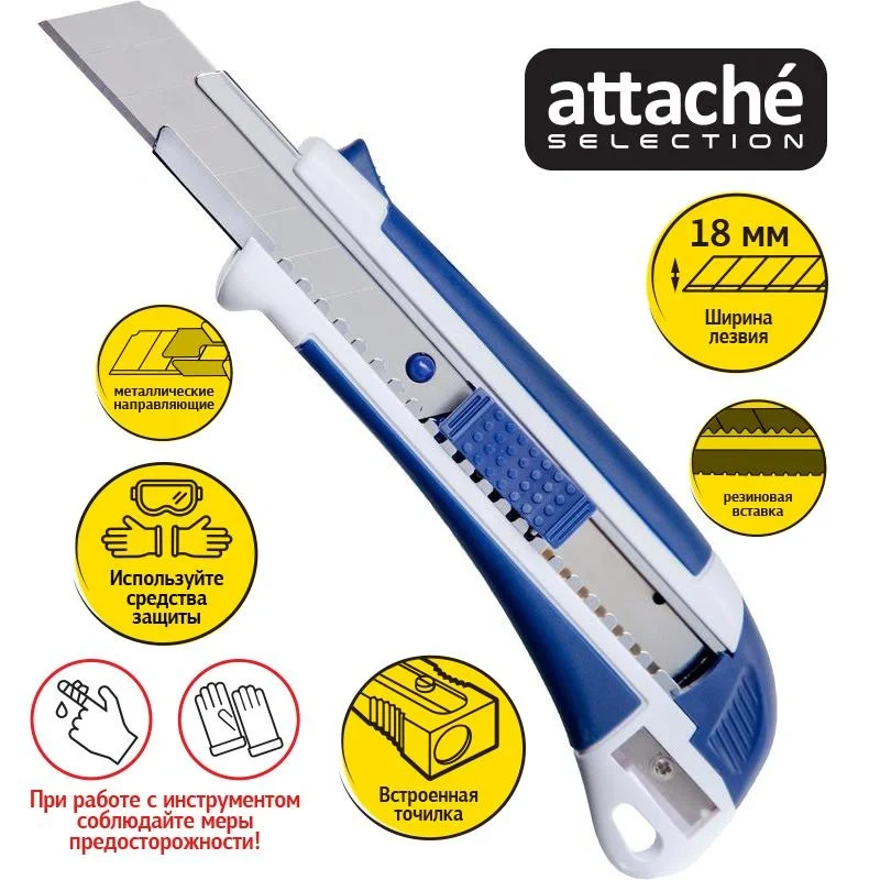 Нож канцелярский Attache Selection с антискользящими вставками и точилкой для карандаша. Используется для резки бумаги, плотного картона, распечатки корреспонденции и посылок. Эргономичная рукоятка с резиновыми вставками контрастного цвета, для увеличения противоскользящих свойств. Металлические направляющие для лезвия увеличивают прочность ножа, создают дополнительную жёсткость при разрезании плотных материалов.
