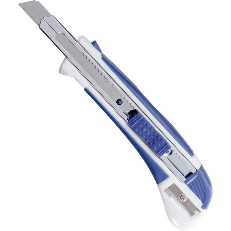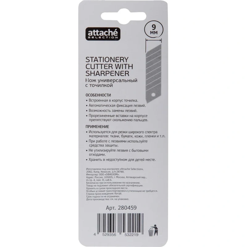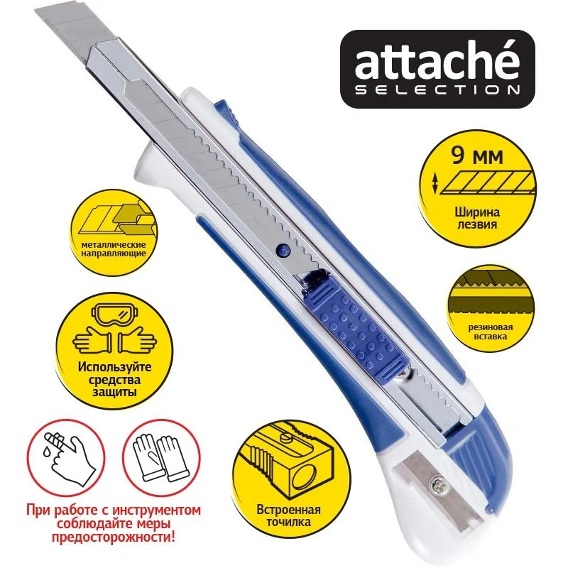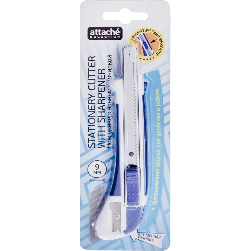 Нож канцелярский Attache Selection с антискользящими вставками и точилкой для карандаша. Используется для резки бумаги, плотного картона, распечатки корреспонденции и посылок. Эргономичная рукоятка с резиновыми вставками контрастного цвета, для увеличения противоскользящих свойств. Металлические направляющие для лезвия увеличивают прочность ножа, создают дополнительную жесткость при разрезании плотных материалов.
