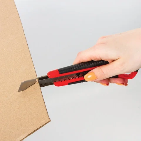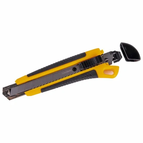 Легкий пластиковый корпус с металлическими направляющими надежно удерживает остро отточенное лезвие стандартной ширины 18 мм. По мере использования отработанные концы лезвия просто отламываются. В комплект входят 2 запасных лезвия. Дизайн корпуса ножа эргономичный. Резиновые края ручки предотвращают скольжение пальцев, исключают их травмирование. Для удобства хранения имеется отверстие для подвеса. Яркая расцветка выделяет инструмент среди других подобных, нож упакован в блистер с европодвесом. Поставляется в нескольких вариантах цвета (без возможности выбора).