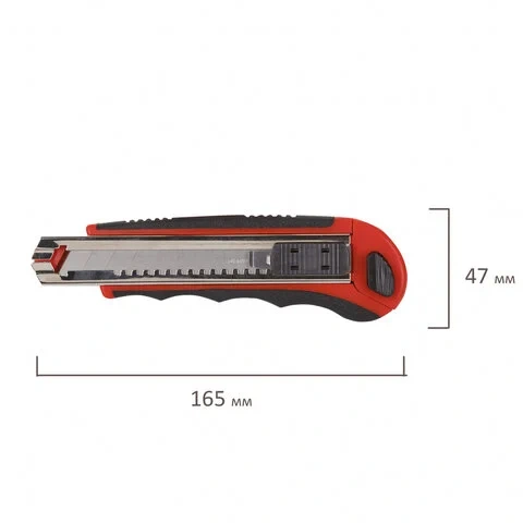 Нож снабжен автоматическим фиксатором лезвия шириной 18 мм. Края инструмента резиновые, предотвращают скольжение руки при работе. Затупившаяся часть отламывается, а по укорачивании одно лезвие легко сменяется другим с помощью механизма автозамены лезвий (к ножу прилагается дополнительные лезвия). Крепкий корпус из пластика исключает опасность получения травмы при работе с ножом. Нож поставляется в блистере с европодвесом. Поставляется в нескольких вариантах цвета (без возможности выбора). Оцените качество заточки канцелярского ножа BRAUBERG «Universal» с 6-ю запасными лезвиями.