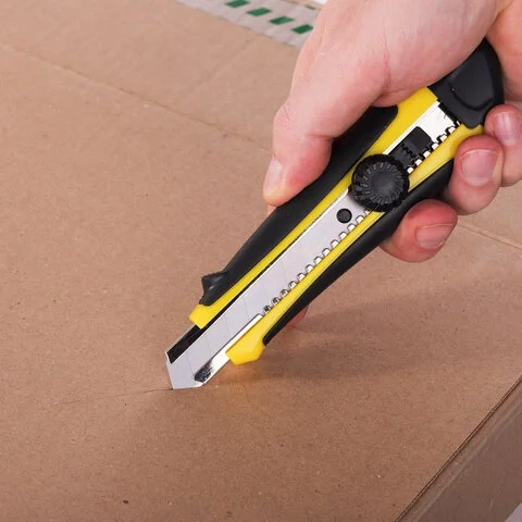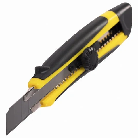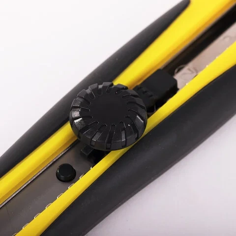 Нож имеет роликовый фиксатор лезвия, легко выдвигающий его на необходимую длину или убирающий внутрь корпуса, который выполнен из желтого пластика с черными резиновыми антискользящими накладками. Ширина лезвия – 18 мм, стандартная. Упакован в пластиковый блистер.