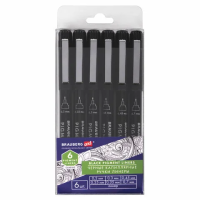 В набор входит 6 черных капиллярных ручек с наконечником типа 'линер'. Размеры наконечников: № 0.2, 0.25, 0.3, 0.35, 0.45, 0.7. Номер на колпачке соответствует толщине линии письма в миллиметрах.
