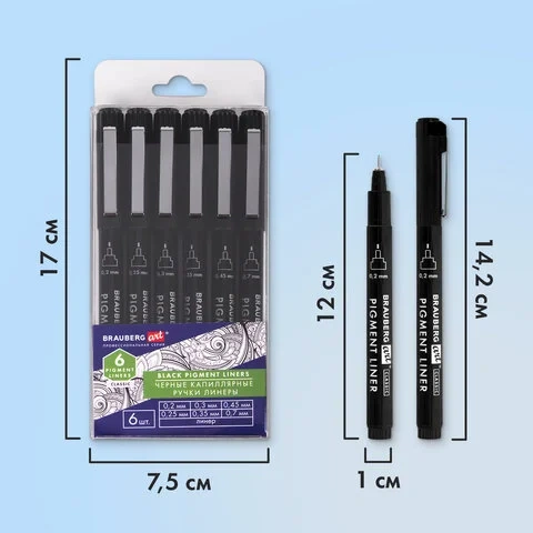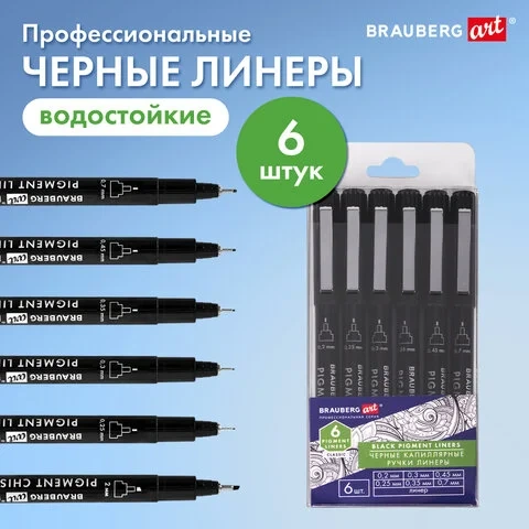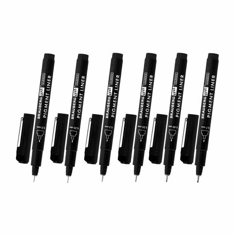 Капиллярные ручки линеры 6 шт. черные, 0,2/0,25/0,3/0,35/0,45/0,7 мм, BRAUBERG ART CLASSIC, 143942