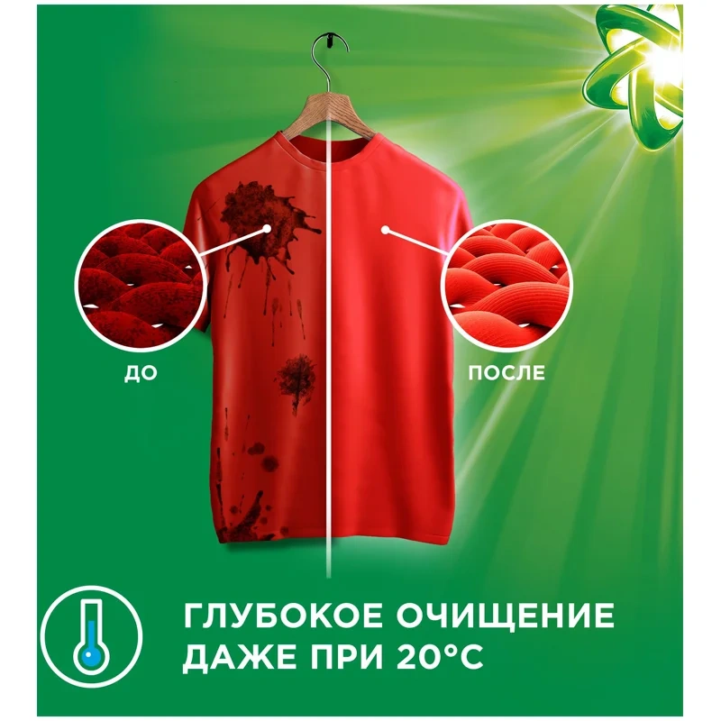 Одна капсула содержит необходимую для стирки дозу лучшего жидкого средства от Ariel для безупречного отстирывания и яркости цвета. Благодаря уникальным технологиям и природным энзимам в составе, Ariel Всё в 1 прекрасно отстирывает сложные пятна даже при температуре 20°C.