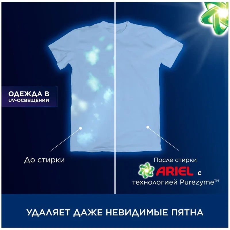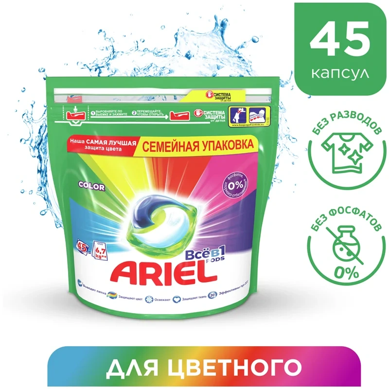 Невероятная чистота в одной маленькой капсуле! Капсулы для стирки Ariel Pods Всё-в-1 для цветного имеют уникальный многосекционный дизайн, позволяющий надежно сохранять компоненты в отдельных секциях капсулы до начала стирки, и обладают высококонцентрированными очищающими свойствами. Инновационная пленка капсул для стирки Ariel полностью растворяется при контакте с водой, позволяя мощным технологиям удалять различные виды пятен.