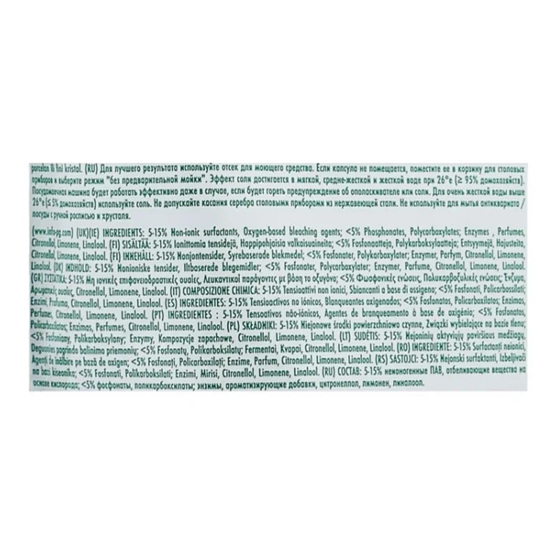 1. Эффективное удаление жира. Двойное действие геля и порошка эффективно удаляет остатки засохшей и пригоревшей пищи, а также следы засохшего жира с первого раза — и вам не придется перемывать посуду самостоятельно. Быстрорастворимые ПАВы и энзимы в составе капсулы обеспечивают эффективную борьбу с загрязнениями любой сложности;