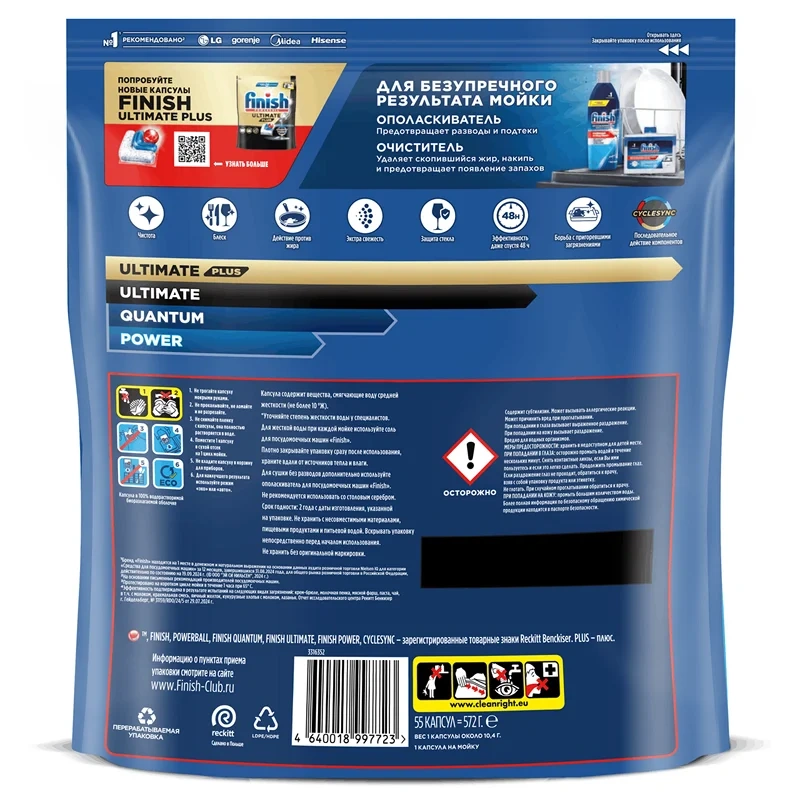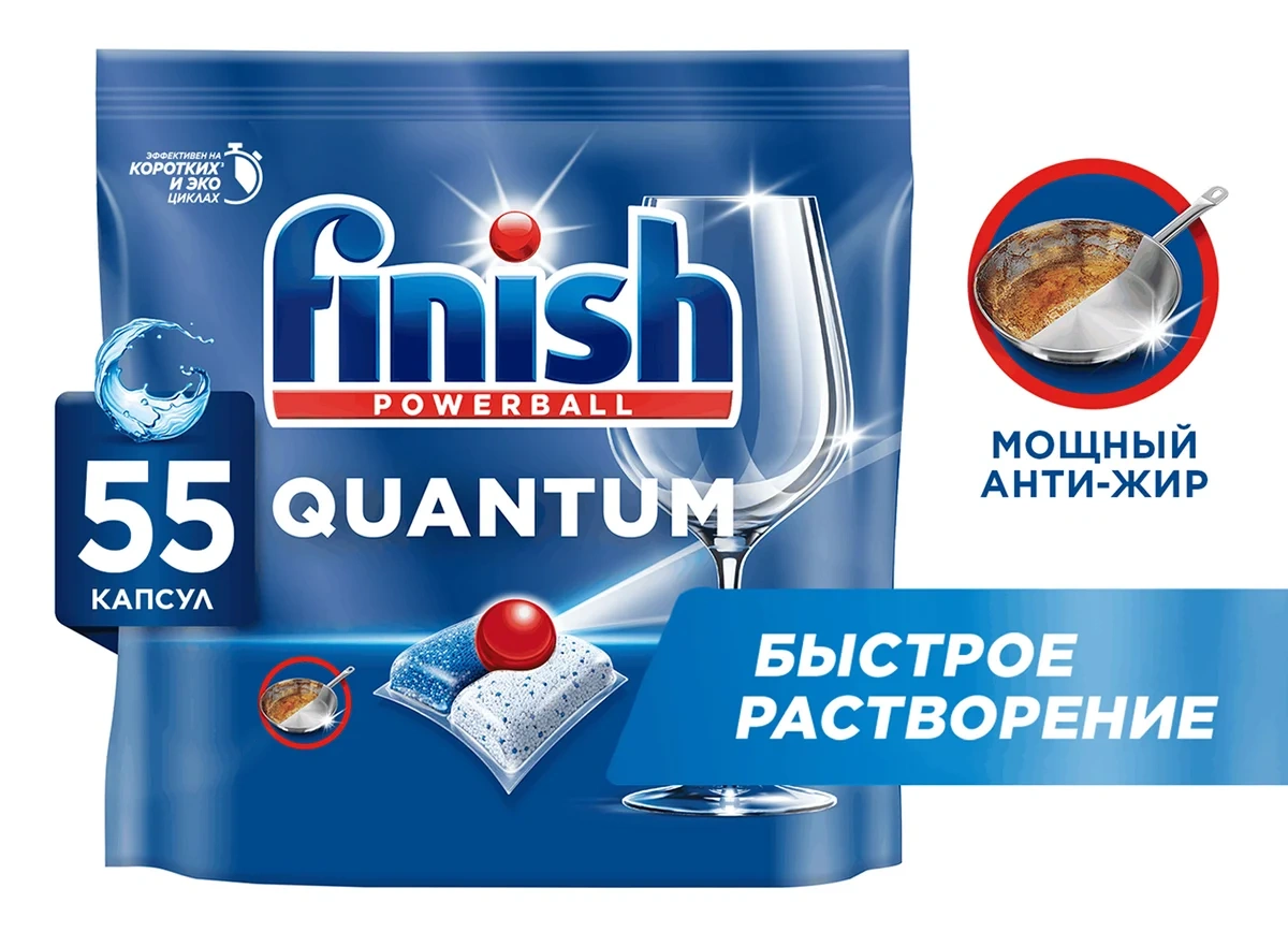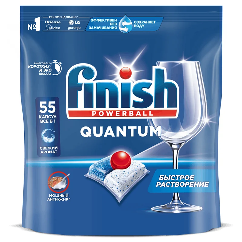 Finish Quantum All in 1 обеспечивает глубокое очищение и ослепительный блеск при каждой мойке.Компактная 3-камерная капсула состоит из трех частей: красный гель - нейтрализует жир и придает ослепительный блеск; два компонента порошка - удаляют сложные белковые и крахмальные загрязнения, а также содержат отбеливающие компоненты на основе кислорода для удаления налета от чая.Finish Quantum All in 1 эффективно справляется с различными видами сложных загрязнений даже без предварительного замачивания!Для достижения максимального результата и при очень жесткой воде рекомендуем попробовать специальную соль и ополаскиватель Finish. Защита и забота о материале, глубокое очищение, ослепительный блеск, эффективное очищение и блеск, безупречный блеск, превосходное очищение. Эффективная формула справляется с загрязнениями, пригоревшей пищей, и обеспечивает отличный результат каждый раз.