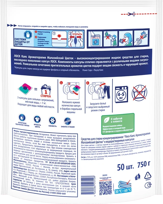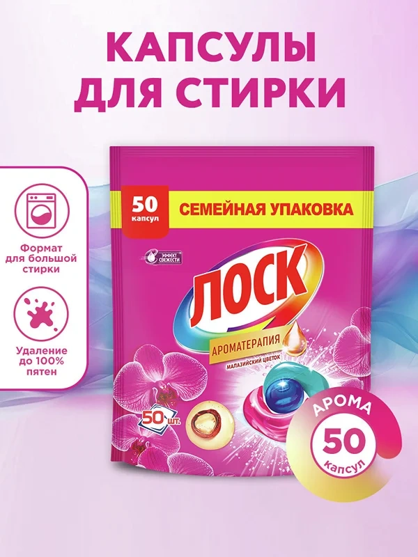 Капсулы выполнены в форме маленьких подушечек. Легкий аромат после стирки легко выражен и надолго сохраняет свежесть вашего белья.
