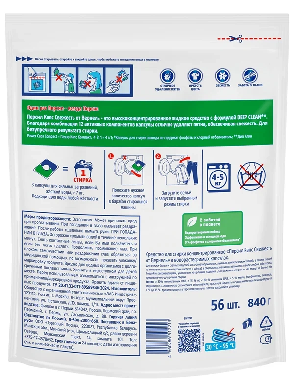 Инновационная оболочка капсул полностью растворится через 2-3 минуты после начала стирки, что делает их идеально подходящими для быстрой экспресс-стирки.
