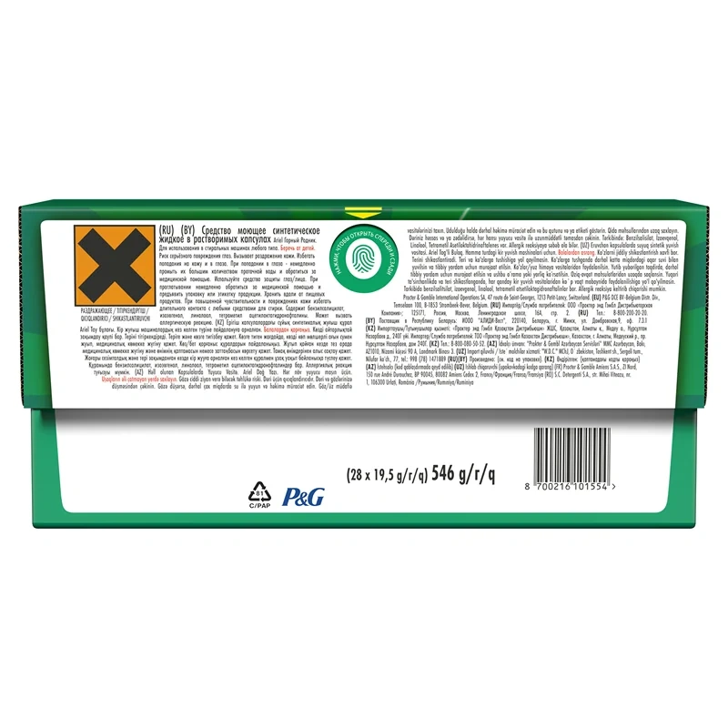 Капсулы для стирки Ariel Горный Родник 28 штук подходят для стирки белого и цветного белья. Благодаря уникальному многосекционному дизайну, превосходное очищение еще никогда не было удобнее. Каждая капсула содержит комплекс мощных активных ингредиентов для эффективного отстирывания. Оболочка растворяется даже в холодной воде. Достаточно лишь добавить капсулу в барабан стиральной машины до загрузки белья. Ariel капсулы содержат высокую концентрацию очищающих веществ: одной капсулы хватит для стирки 4-5 кг белья для стирки того же количества потребовалось бы 65 мл геля для стирки Ariel. Преимущества жидкого средства для стирки Ariel: Прекрасно отстирывает сложные пятна даже при температуре 20C; Невероятная чистота в одной капсуле для стирки; Обеспечивает безупречное отстирывание и яркость белого; Превосходная чистота даже при 20C; Простота использования: не нужно отмерять и наливать; Не содержит фосфатов и хлорных отбеливателей. Капсулы Ariel Горный родник также доступны в большой упаковке 45 штук с более выгодной ценой за каждую стирку. Храните упаковки капсул в месте, недоступном для детей.