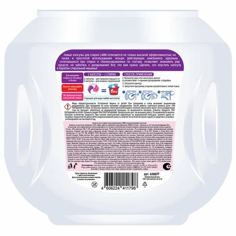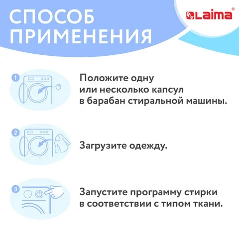 Капсулы подходят для стирки цветных изделий из хлопчатобумажных, льняных, синтетических тканей и тканей из смешанных волокон (кроме шелка и шерсти).
