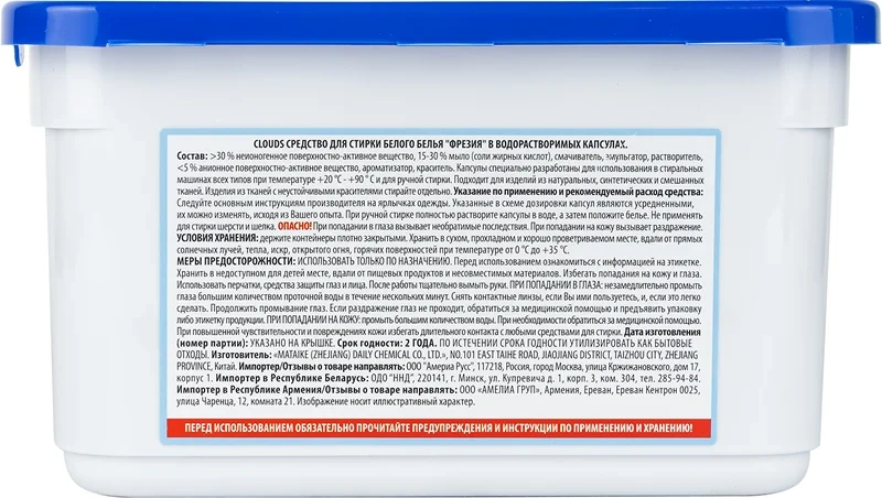 Капсулы Clouds для стирки белого белья Фрезия эффективно удаляют загрязнения, не повреждая волокна ткани. Капсулы полностью растворяются в воде во время стирки и имеют приятный, ненавязчивый аромат. Перед использованием ознакомьтесь с инструкцией на упаковке.