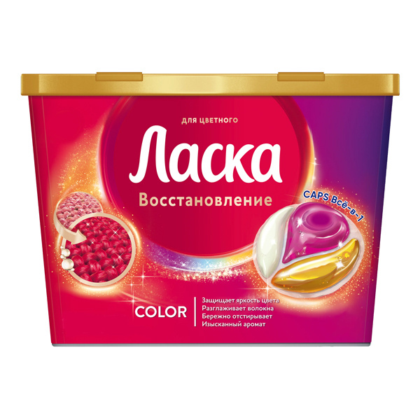 Капсулы для стирки Ласка Эффект Восстановления для Цветного, жидкое средство для стирки 24 стирок специально разработано для активного ухода за Вашей одеждой ярких цветов и поддержания первозданной красоты вещей стирка за стиркой. Специальная формула Fibrex-tech (Фибрекс-тек) жидкого средства для стирки Ласка не только бережно отстирывает загрязнения, но и отлично заботится о Вашей одежде в двух ключевых направлениях: насыщенность цвета и прочность ткани