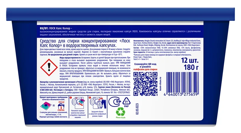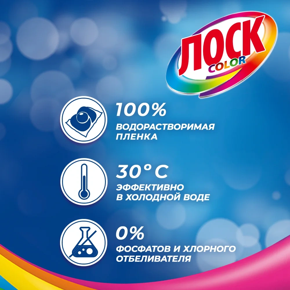 Капсулы Лоск Колор – это еще один современный формат стирки: больше не нужно задумываться о правильной дозировке, 1 капсула – 1 стирка; эффективны в воде любой жесткости при 30C; не оставляют следов на одежде; 100 % водорастворимая пленка.