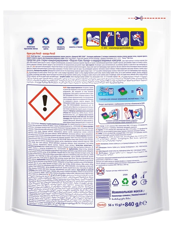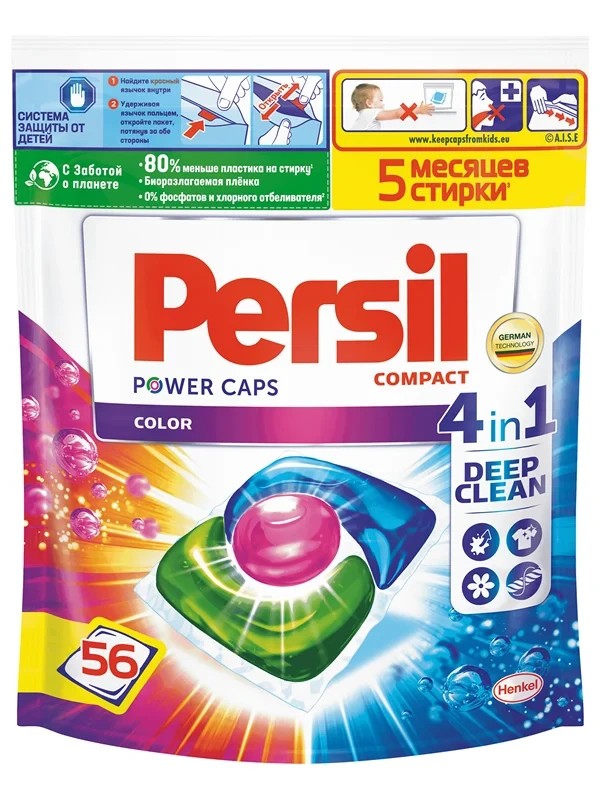 Капсулы для стирки Persil Power Caps 4в1 Колор 56шт предназначены для цветного текстиля, но их можно использовать и для белой одежды. Уже после первого использования они удаляют даже трудновыводимые пятна, сохраняя насыщенный цвет ткани. В каждой капсуле содержится определенная доза средства, которой достаточно для одного цикла стирки в машинке-автомат. Находясь в барабане, оболочка капсулы быстро растворяется, и ее содержимое начинает мгновенно действовать. Капсулы не содержит фосфатов и полностью безопасен для здоровья. Они показывают эффективность даже во время стирки при температуре 30 градусов. Они помещены в упаковку, что повышает безопасность использования. Перед началом цикла капсулу следует отправить в барабан, после чего уложить сверху белье и запустить машинку. После стирки одежда будет наполнена свежим приятным ароматом.