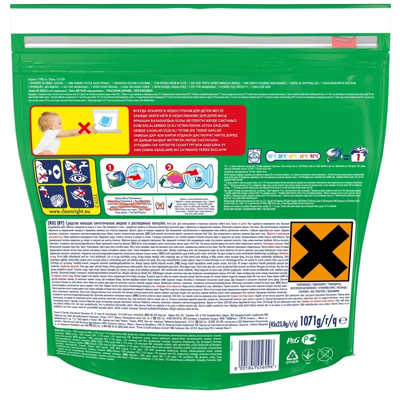 Капсулы ARIEL Color также доступны в упаковке 60 штук с еще более выгодной ценой за каждую стирку. Храните упаковки капсул в месте, недоступном для детей.