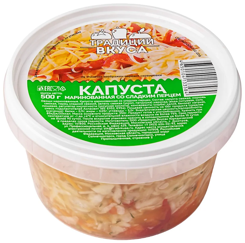 Капуста Традиции вкуса Витаминка маринованная со сладким перцем 500 г изготовлена по классическим рецептам из отборных овощей, которые прошли проверку на качество и экологичность. Это кладезь витамина С и натрия, необходимых для поддержания иммунитета, активности, правильной работы сердечной и пищеварительной системы. Хрустящая капуста нашинкована тонкими полосками. Она обладает приятным солоноватым вкусом, который понравится взрослым и детям. Капуста сохраняет все ценные микроэлементы, которые заложила в ее состав природа. Продукт упакован в удобный пластиковый контейнер, который позволяет в течение всего срока годности сохранять его оригинальные органолептические свойства. Компания Традиции вкуса работает на рынке 3 года. За это время мы построили и расширили свое производство, встали на полки крупнейших федеральных сетей, реализовали крупные государственные контракты, запустили собственный торговый дом.