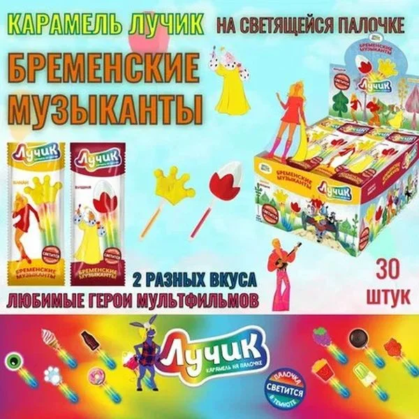 Карамель на светящейся палочке С лицензией Союзмультфильма - бременские музыканты . В блоке 2 разных вкуса И формы карамели: яйцо для непослушной дочки и корона, со вкусами вишня и банан. Для того, чтобы палочка засветилась, нужно слегка ЕЕ согнуть И потрясти. Светящаяся палочка будет радовать ВАС В течение 6 часов!