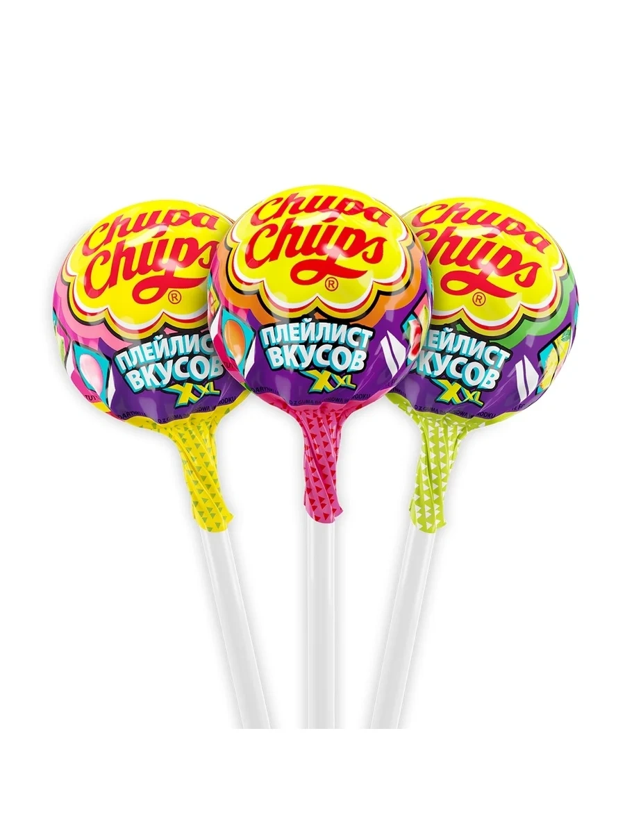 Новый Chupa Chups xxl Плейлист вкусов поразит неожиданными комбинациями вкусов всё в одном леденце! Внутри разноцветная жвачка никогда не угадаешь, какой вкус тебе попадётся. Необычные двухслойная карамель какой новый вкус ждёт тебя там? Будто любимые треки в плейлисте просто перемешай!