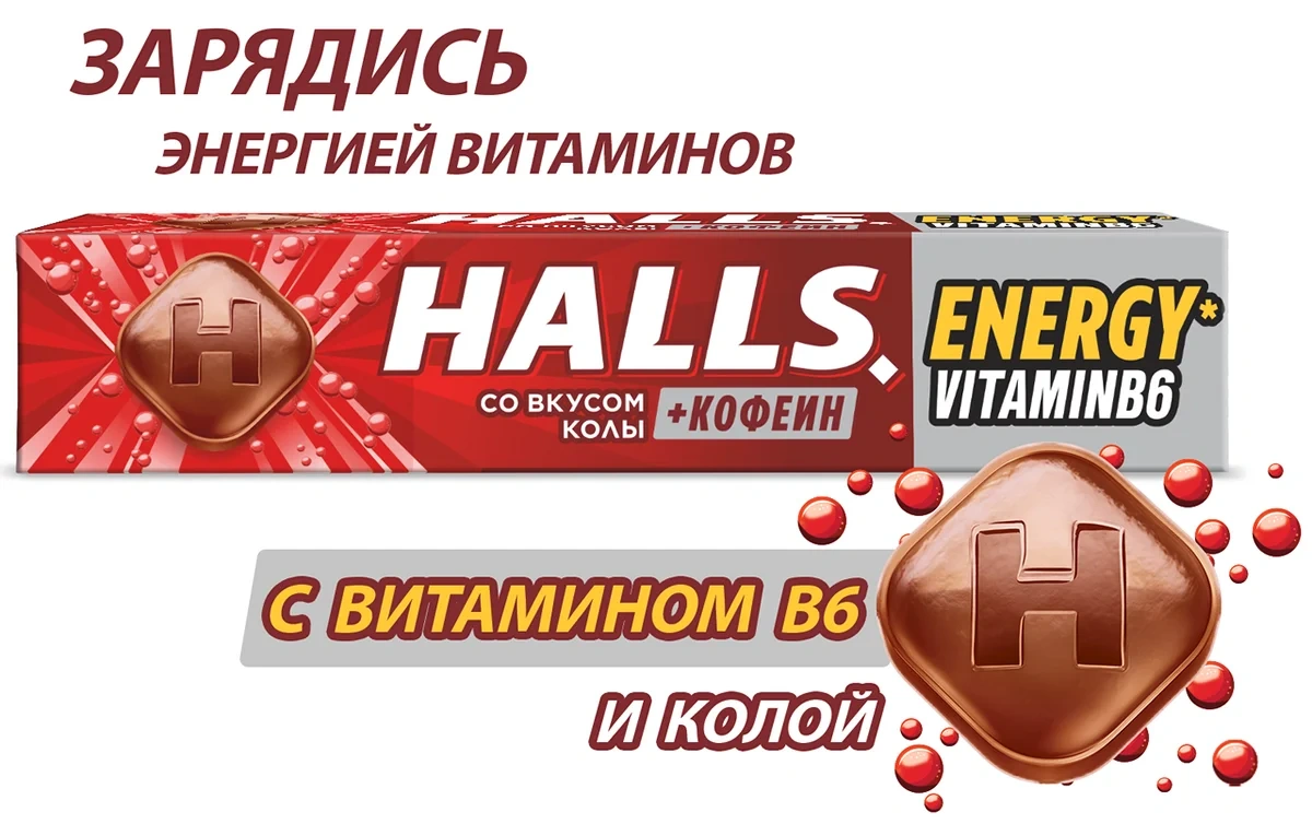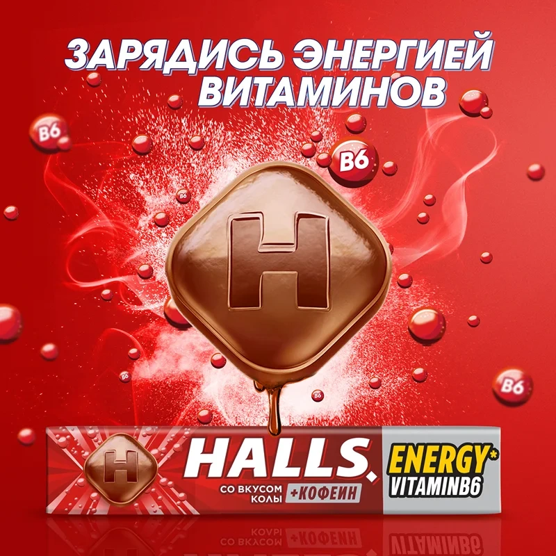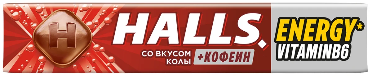 Карамель леденцовая Halls с кофеином, витамином В6 и вкусом колы, 25г