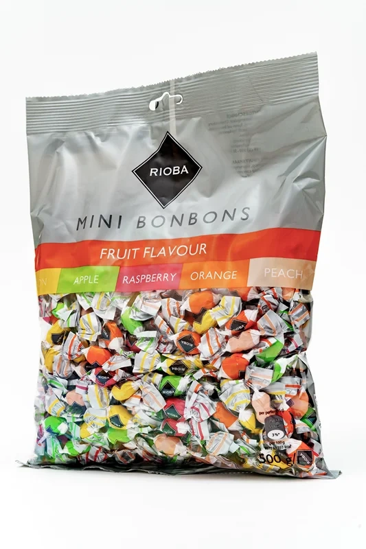Карамель фруктовая мини RIOBA, 500 г подарит вам хорошее настроение. Внутри яркой фирменной упаковки вы найдете маленькие аккуратные карамельки, которые принесут вам и вашим клиентам радостные сладкие минуты. Угостите конфетами RIOBA гостей отеля или кафе. В любое время года сладости своим фруктовым вкусом напомнят им о лете. Кажется, что это не карамель, а подслащенные кусочки настоящих свежих фруктов.На первый взгляд кажется, что полкилограмма лакомства хватит надолго. Но стоит только открыть пакет, и вы не сможете остановиться. Состав: сахар, глюкозный сироп, ароматизатор идентичный натуральному, мята, краситель.Пищевая ценность в 100г: белок - 0 г, углеводы - 5,34 г.Энергетическая ценность в 100г: 388 ккал.Условия хранения: хранить при температуре +18С.Срок годности: 12 месяцев.